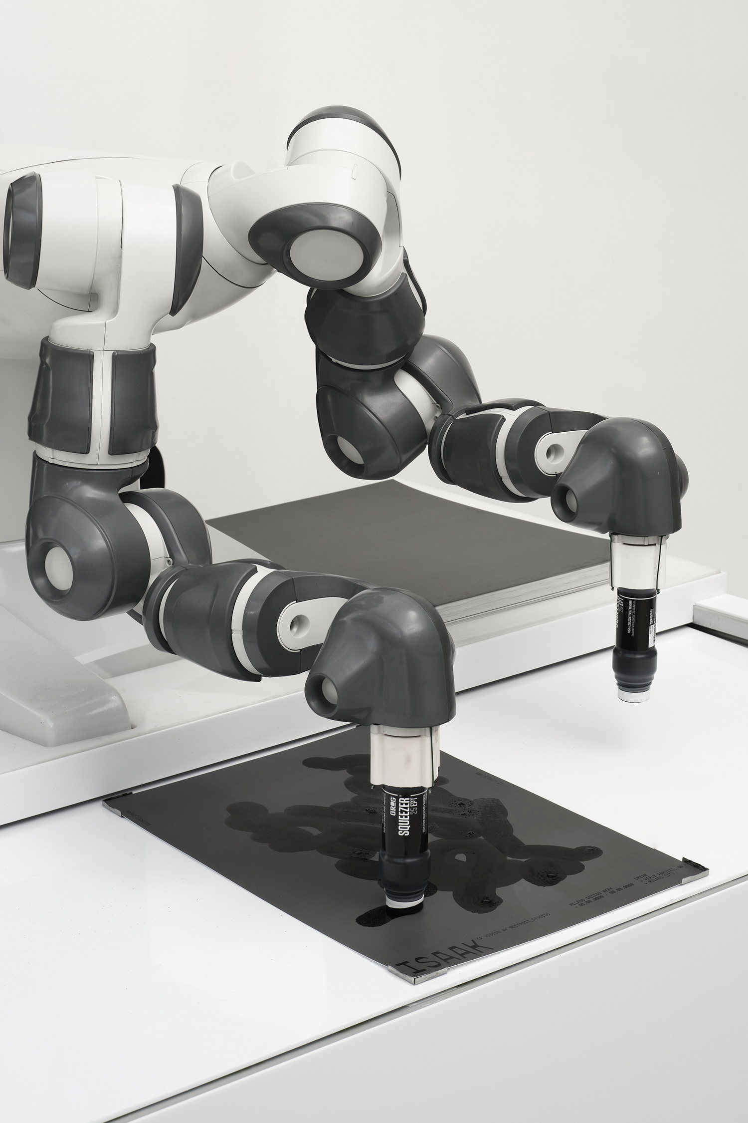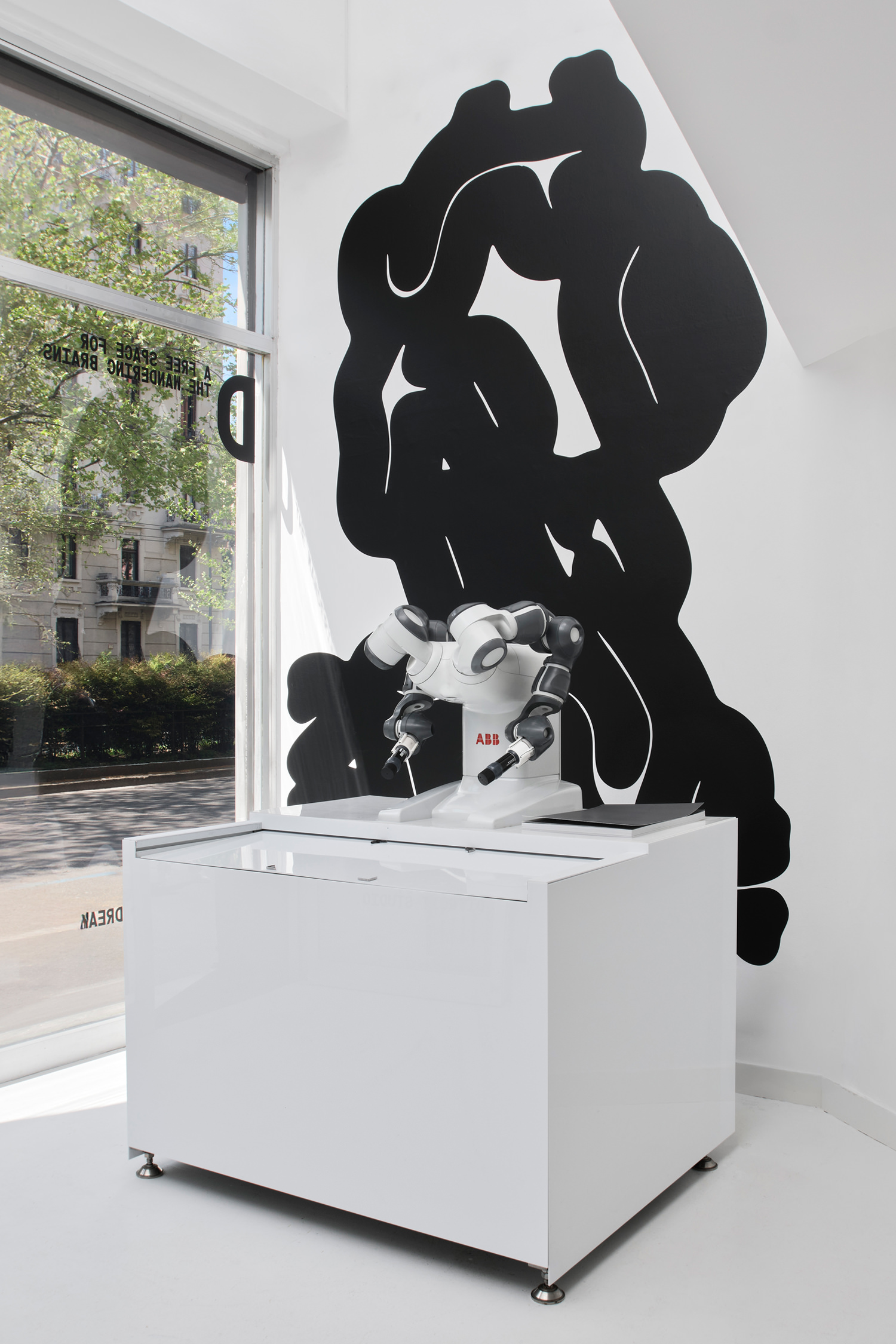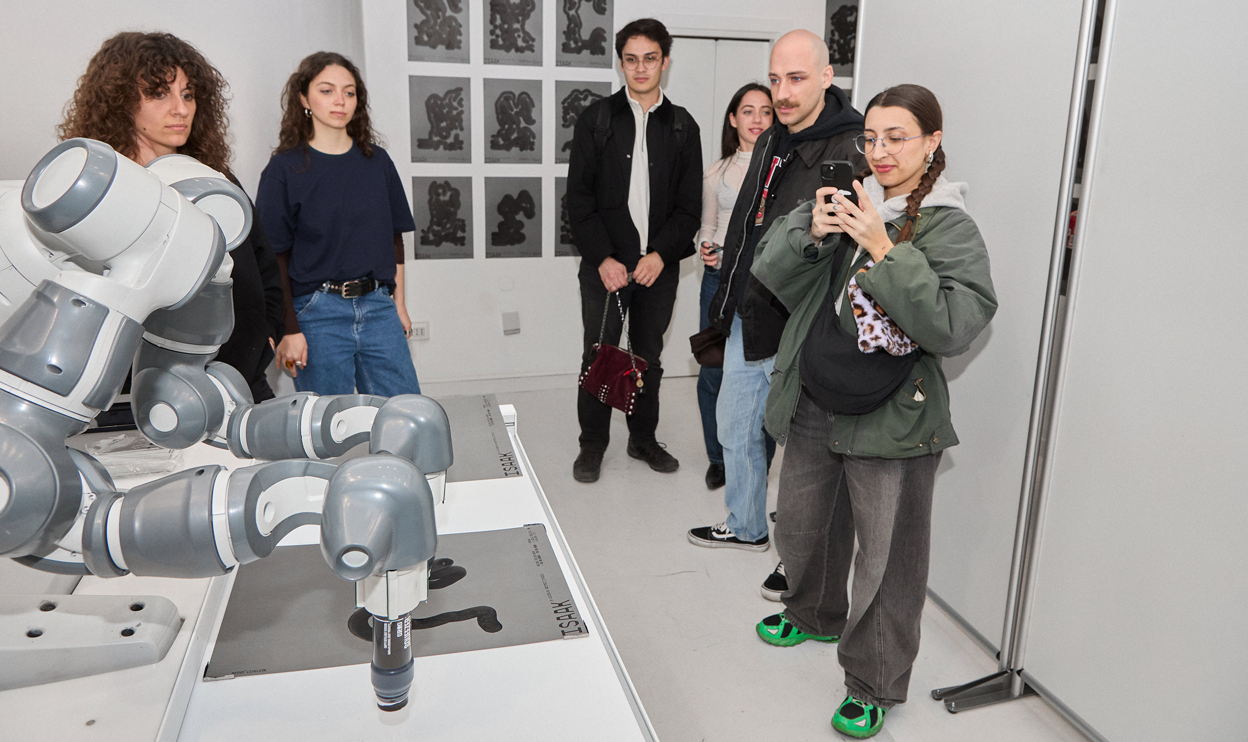 The tangible body of ISAAK is the latest-generation collaborative robot by ABB, engineered to work safely with humans in shared spaces. Endowed with two mechanical arms and featuring seven rotary axes, the robot was programmed to move with the grace and precision of a craftsman, pushing its capabilities to their expressive limit. This machine is acknowledged as one of the smallest and most agile collaborative robots on the market. Its intangible soul, instead, lies in the software system that processes the input and transforms it into drawings with a distinctive and personal style.