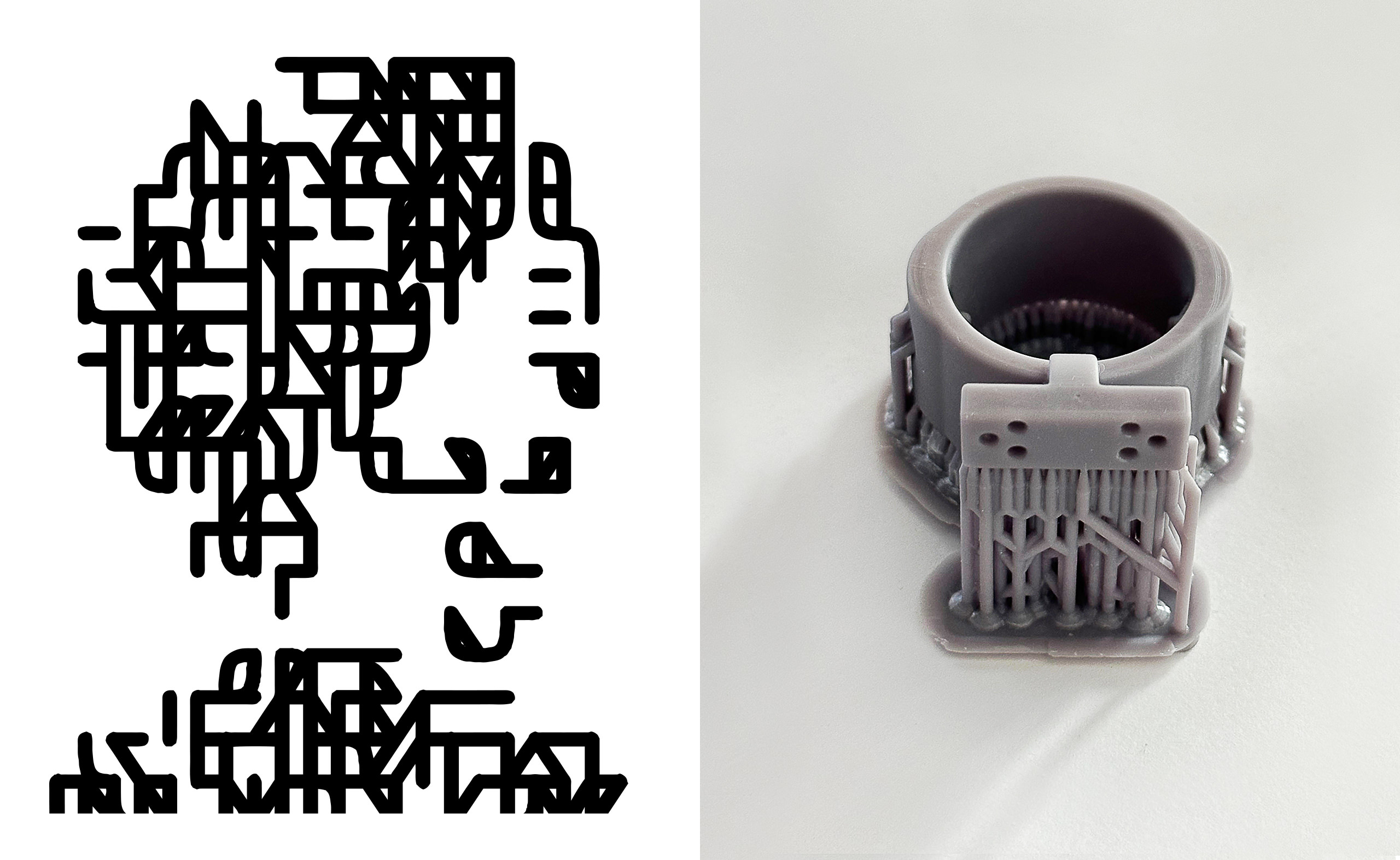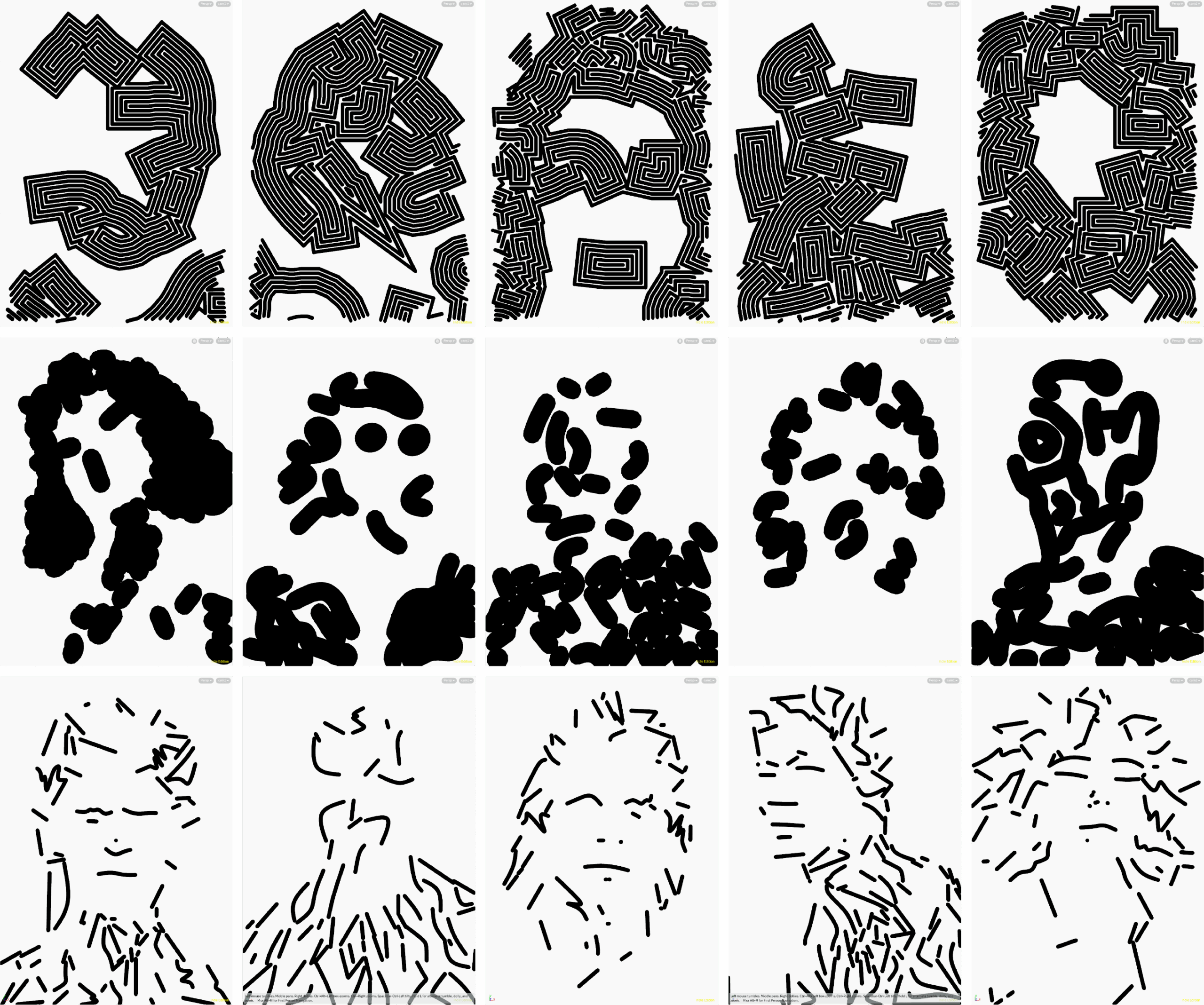 This section unveils a broad series of digital tests developed over the previous months, exploring a range of drawing styles—from pencil to pen to marker. As an interesting side note, we even ventured into 3D printing, prototyping one of the custom components designed to fasten the marker onto the robotic arm.