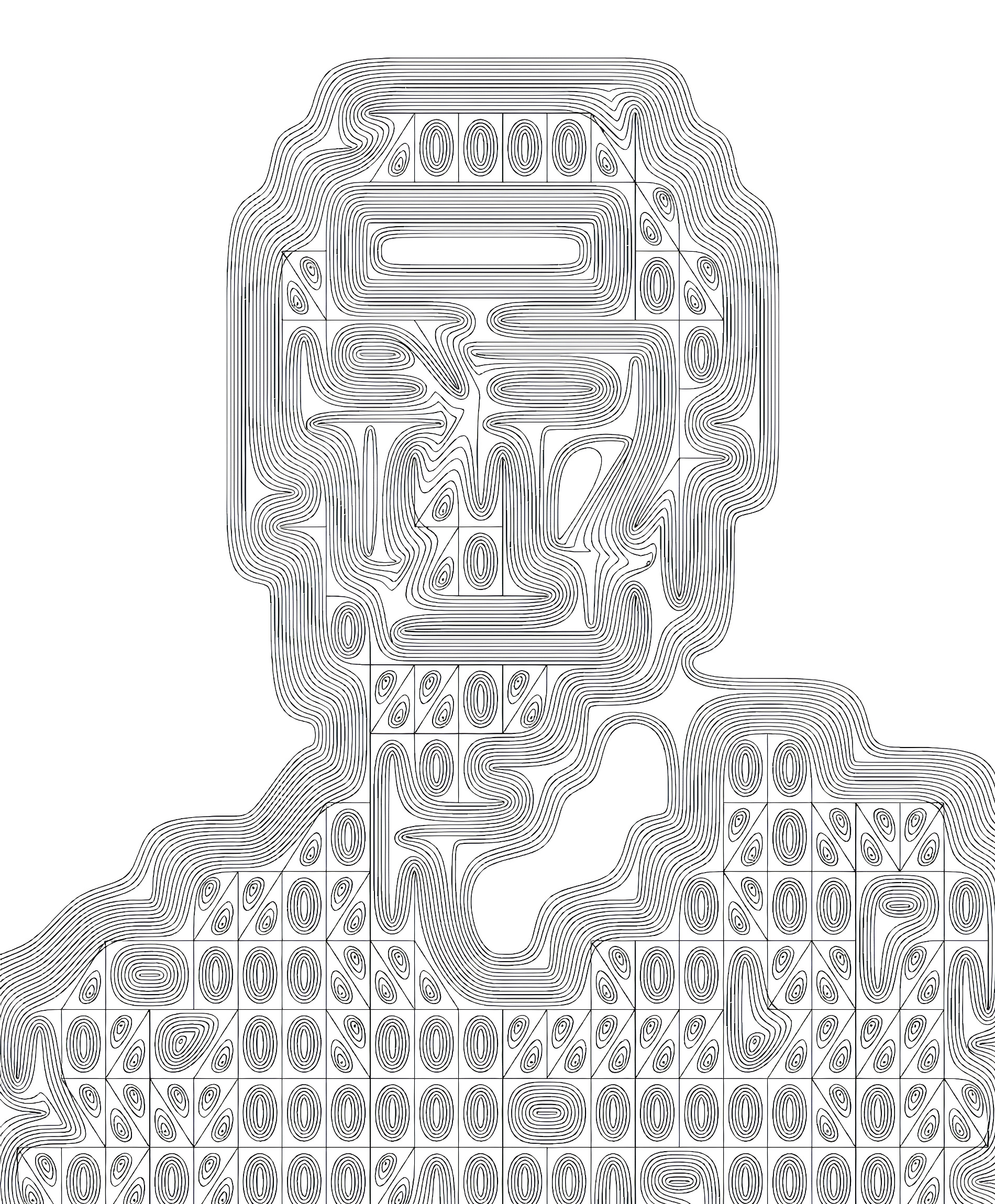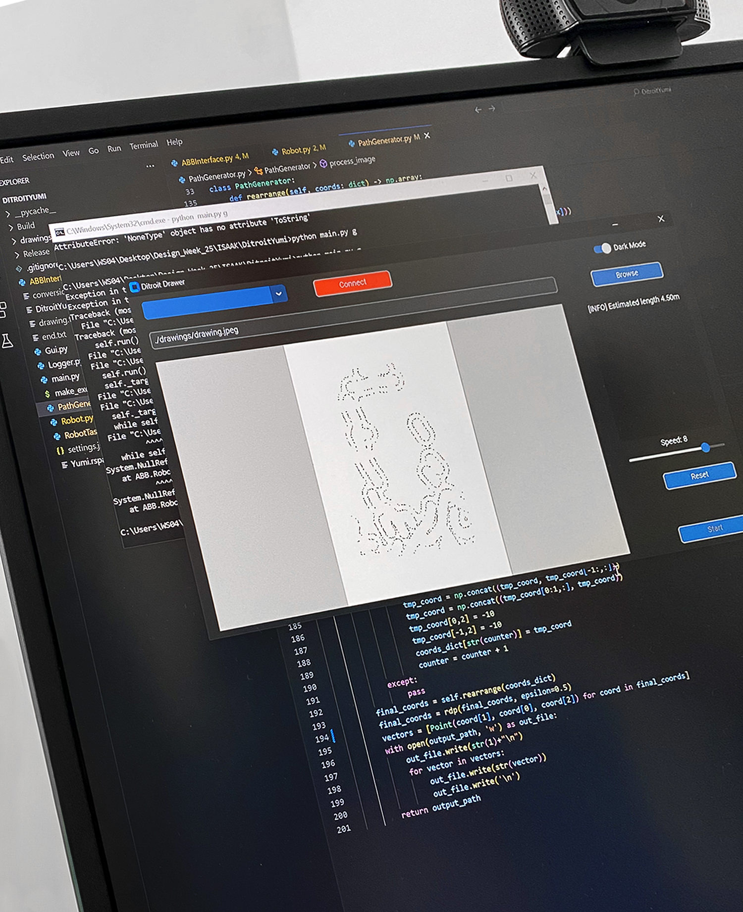 The performance unfolds in a clear and linear sequence: a webcam captures the visitor’s image, which is then processed by the software. The code generates several digital interpretations, one of which is selected and translated into vector coordinates. These are transmitted to the robot, which immediately executes the drawing on paper. The finished portrait is then given to the participant.